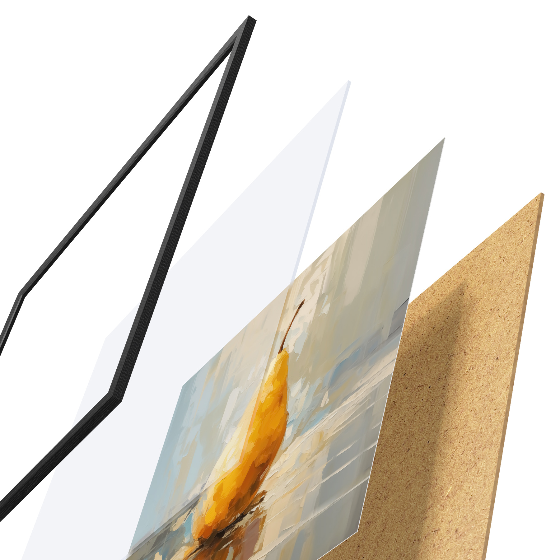 De poster bestaat uit een frame, plexiglas, geprinte afbeelding en spaanplaat achterkant. De poster kan meteen aan de muur worden gehangen dankzij de bevestigingen op de achterkant.