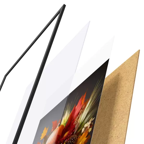 De poster bestaat uit een frame, plexiglas, geprinte afbeelding en spaanplaat achterkant. De poster kan meteen aan de muur worden gehangen dankzij de bevestigingen op de achterkant.