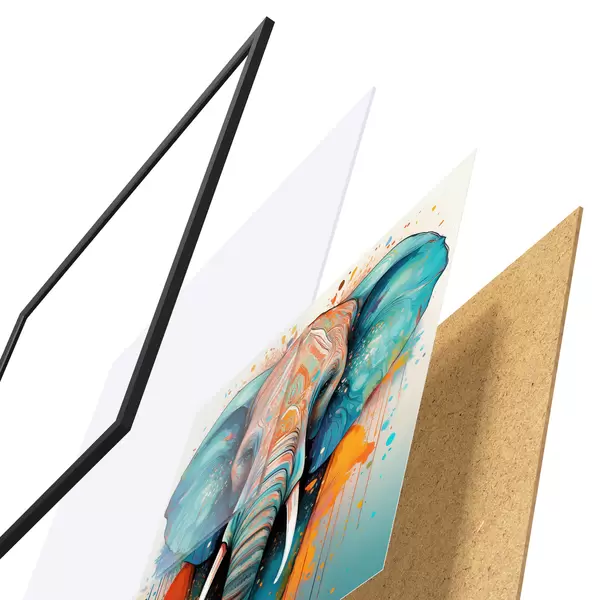 De poster bestaat uit een frame, plexiglas, geprinte afbeelding en spaanplaat achterkant. De poster kan meteen aan de muur worden gehangen dankzij de bevestigingen op de achterkant.