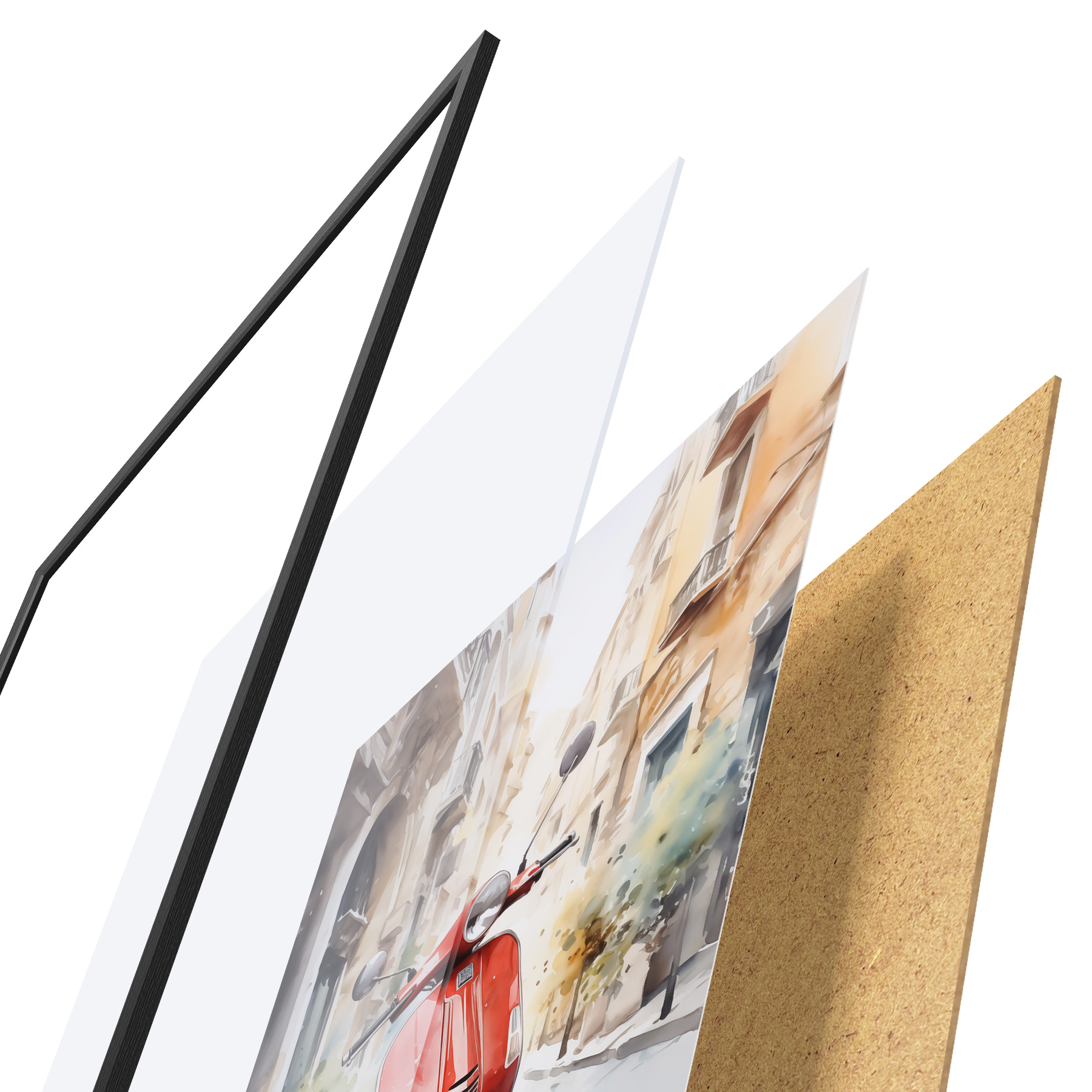 De poster bestaat uit een frame, plexiglas, geprinte afbeelding en spaanplaat achterkant. De poster kan meteen aan de muur worden gehangen dankzij de bevestigingen op de achterkant.