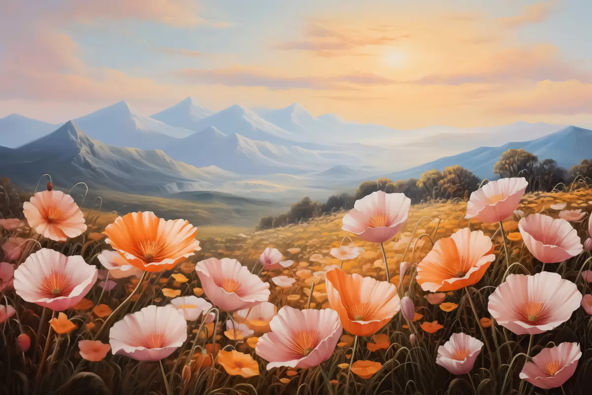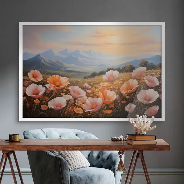 Poster Klaprozenveld bij zonsopgang met bergen op de achtergrond Nr f40730