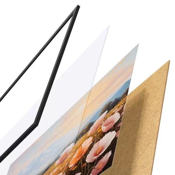 De poster bestaat uit een frame, plexiglas, geprinte afbeelding en spaanplaat achterkant. De poster kan meteen aan de muur worden gehangen dankzij de bevestigingen op de achterkant.