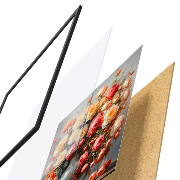 De poster bestaat uit een frame, plexiglas, geprinte afbeelding en spaanplaat achterkant. De poster kan meteen aan de muur worden gehangen dankzij de bevestigingen op de achterkant.