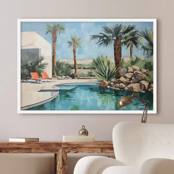 Poster Palmbomen bij het hotel met een zwembad bij de rotsen, blauwe, groene, rode kleur Nr f40748