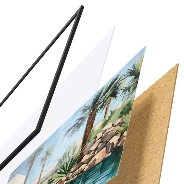 De poster bestaat uit een frame, plexiglas, geprinte afbeelding en spaanplaat achterkant. De poster kan meteen aan de muur worden gehangen dankzij de bevestigingen op de achterkant.