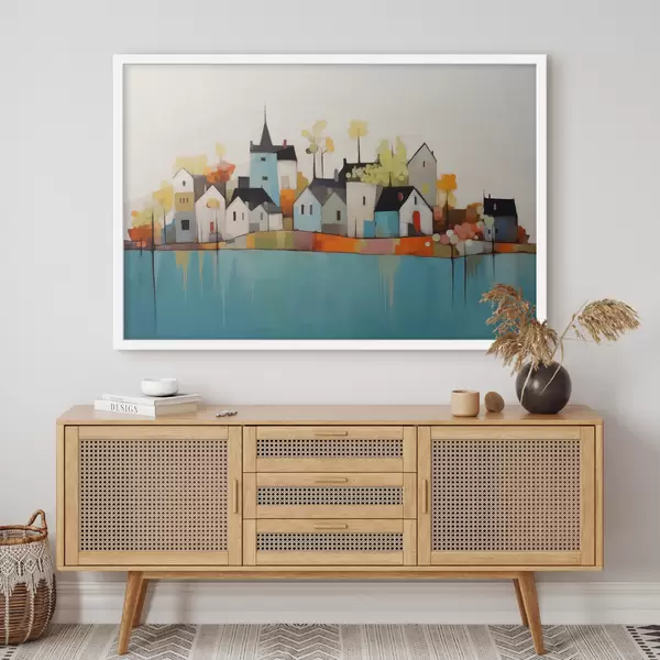 Poster Abstracte stad en huizen, blauw, geel, rode kleur Nr f40751