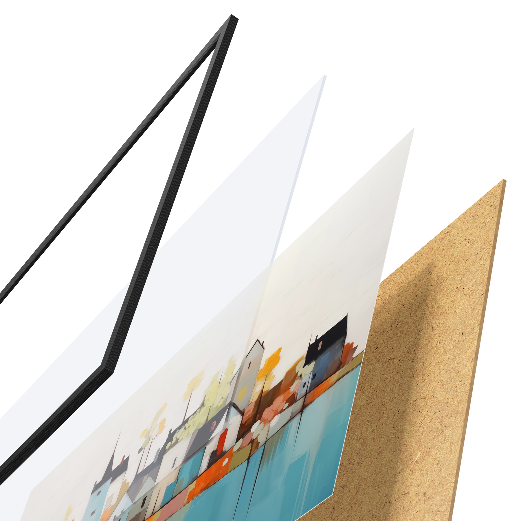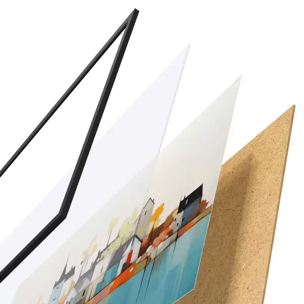 De poster bestaat uit een frame, plexiglas, geprinte afbeelding en spaanplaat achterkant. De poster kan meteen aan de muur worden gehangen dankzij de bevestigingen op de achterkant.