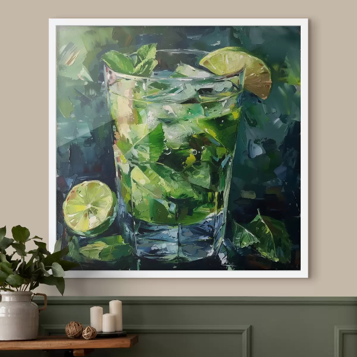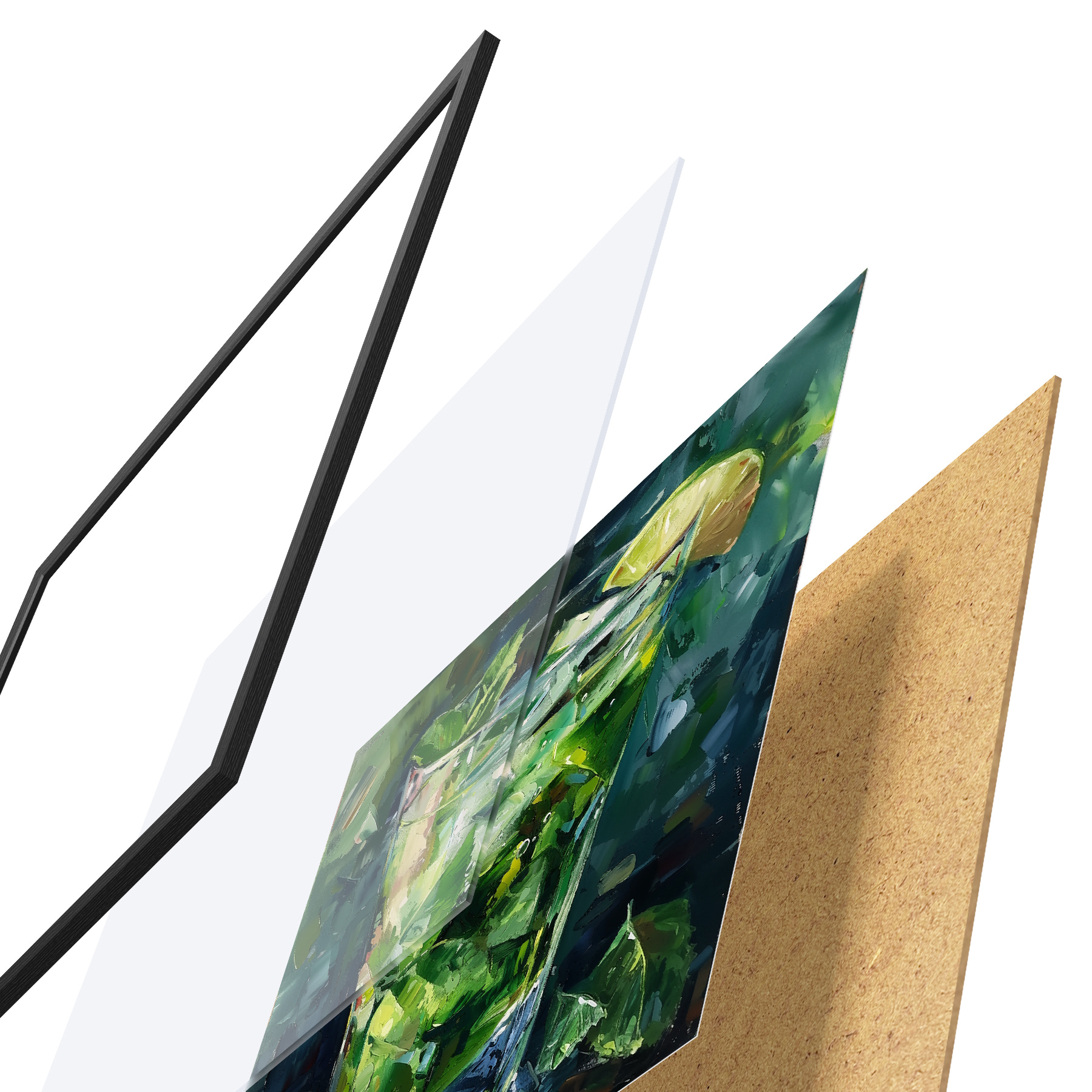 De poster bestaat uit een frame, plexiglas, geprinte afbeelding en spaanplaat achterkant. De poster kan meteen aan de muur worden gehangen dankzij de bevestigingen op de achterkant.