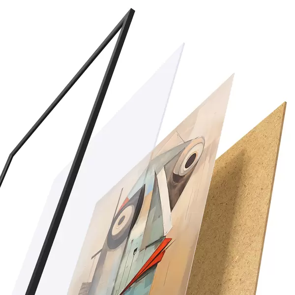 De poster bestaat uit een frame, plexiglas, geprinte afbeelding en spaanplaat achterkant. De poster kan meteen aan de muur worden gehangen dankzij de bevestigingen op de achterkant.