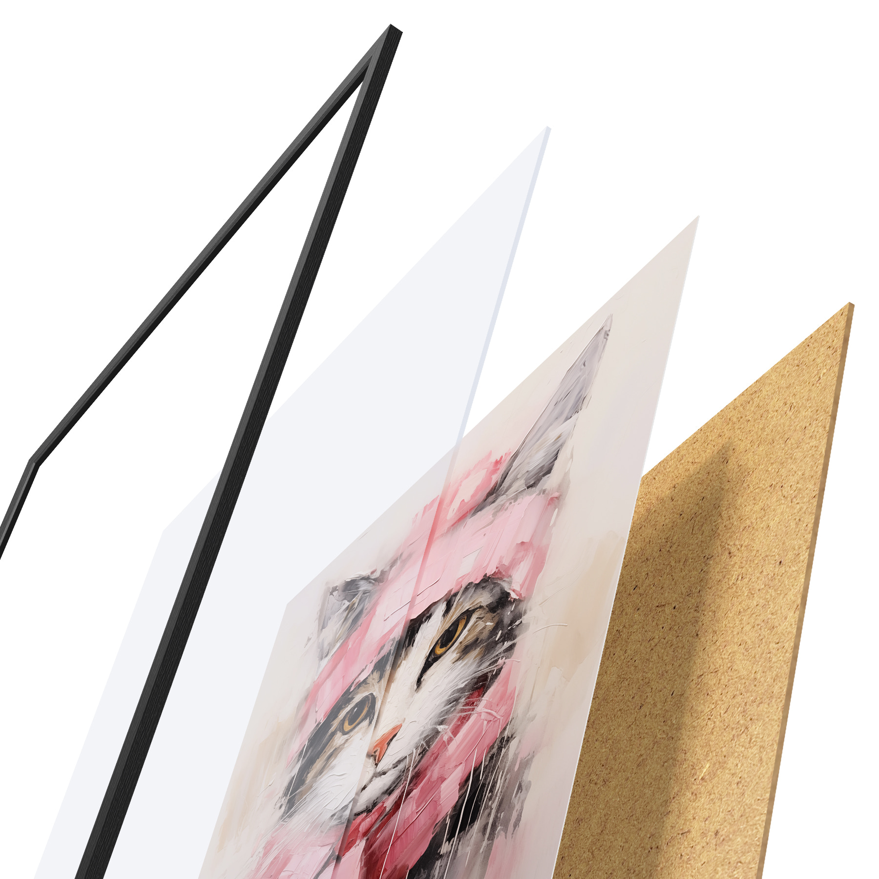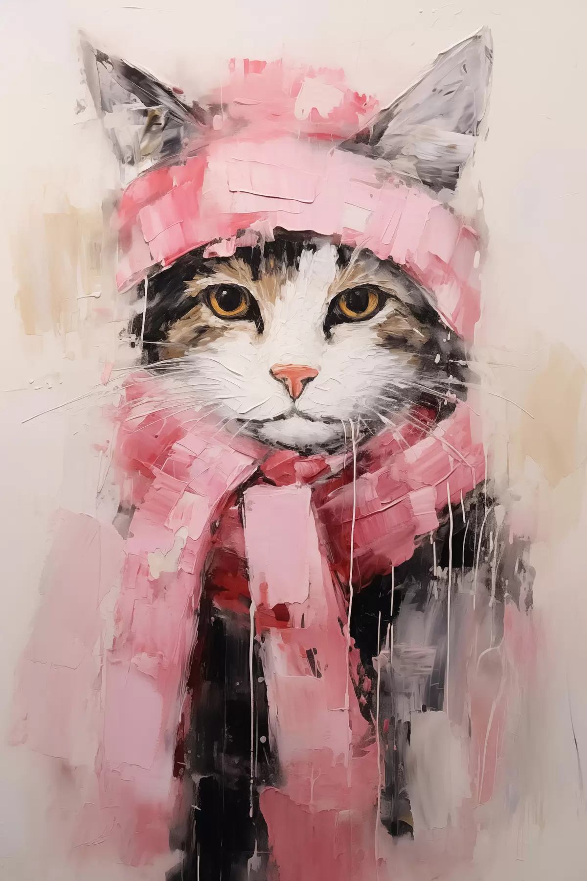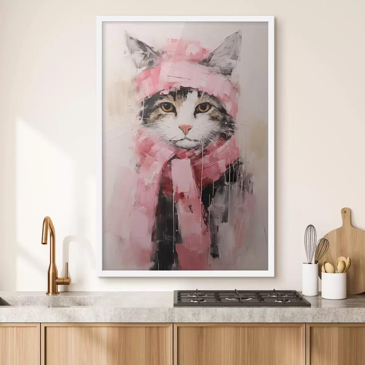 Poster Grijze zwarte kat met roze muts en sjaal Nr f40801