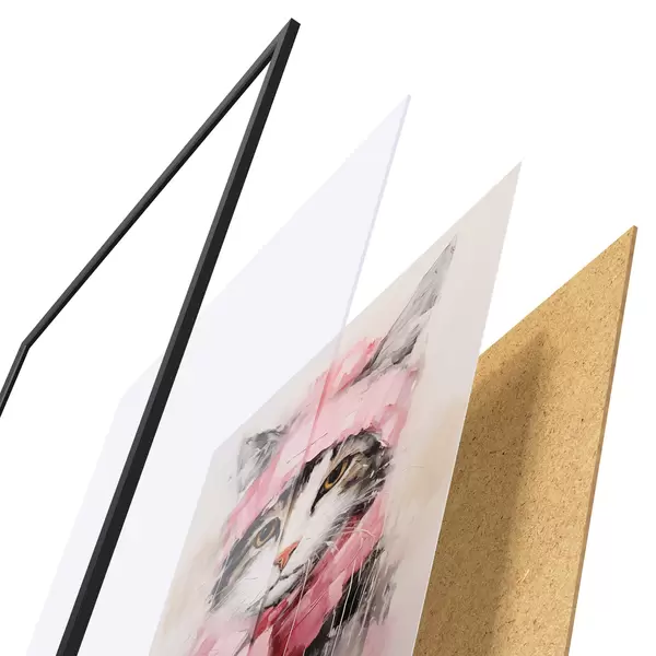 De poster bestaat uit een frame, plexiglas, geprinte afbeelding en spaanplaat achterkant. De poster kan meteen aan de muur worden gehangen dankzij de bevestigingen op de achterkant.