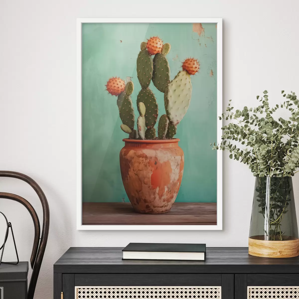 Poster Cactus in een oude kleipot tegen een blauwgroene muur f40807