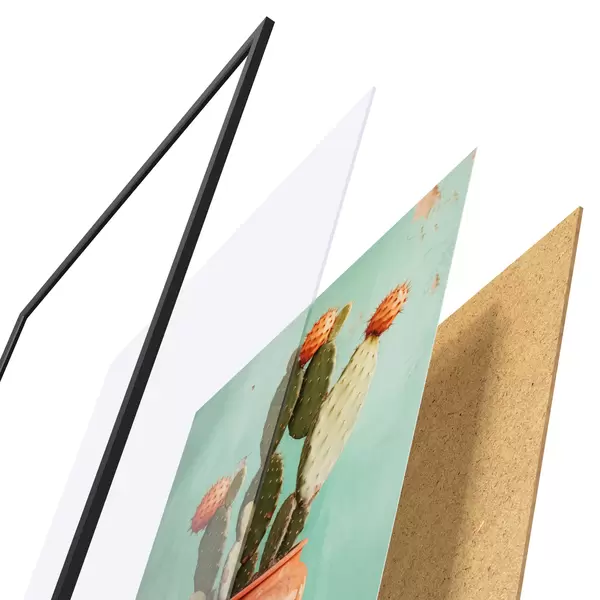De poster bestaat uit een frame, plexiglas, geprinte afbeelding en spaanplaat achterkant. De poster kan meteen aan de muur worden gehangen dankzij de bevestigingen op de achterkant.