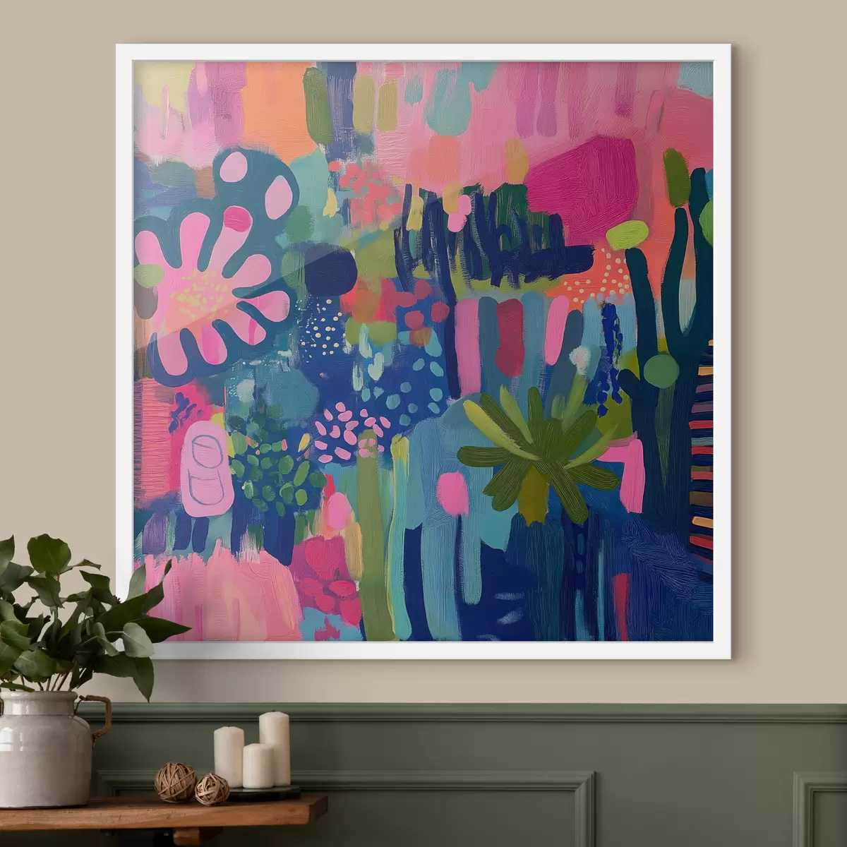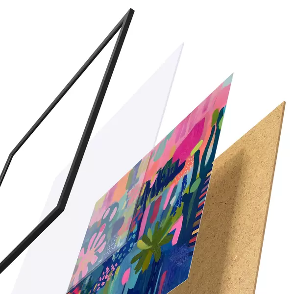 De poster bestaat uit een frame, plexiglas, geprinte afbeelding en spaanplaat achterkant. De poster kan meteen aan de muur worden gehangen dankzij de bevestigingen op de achterkant.