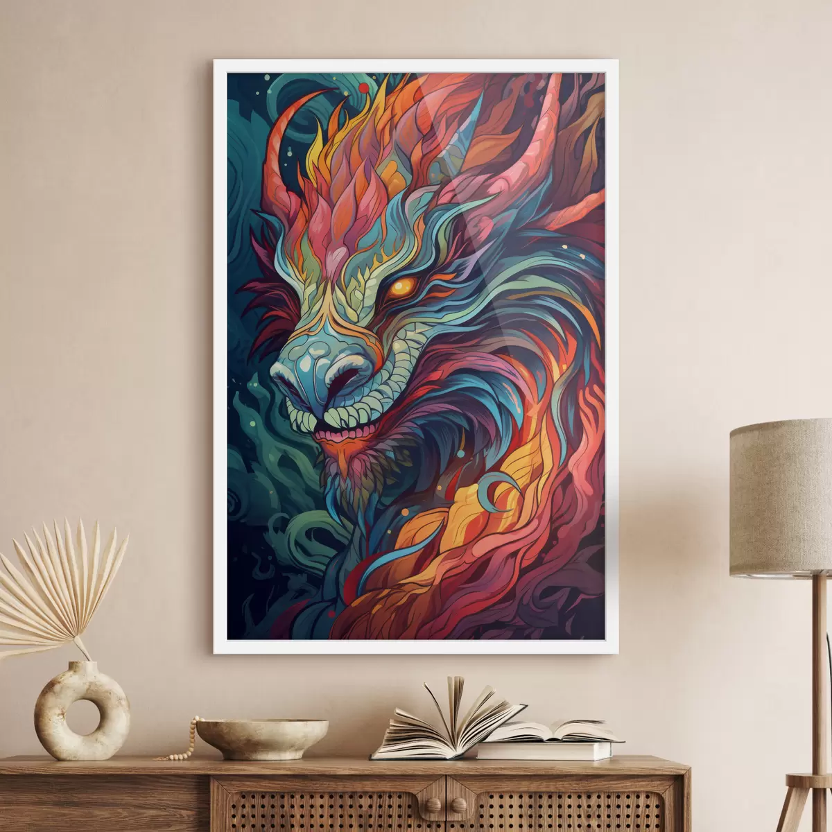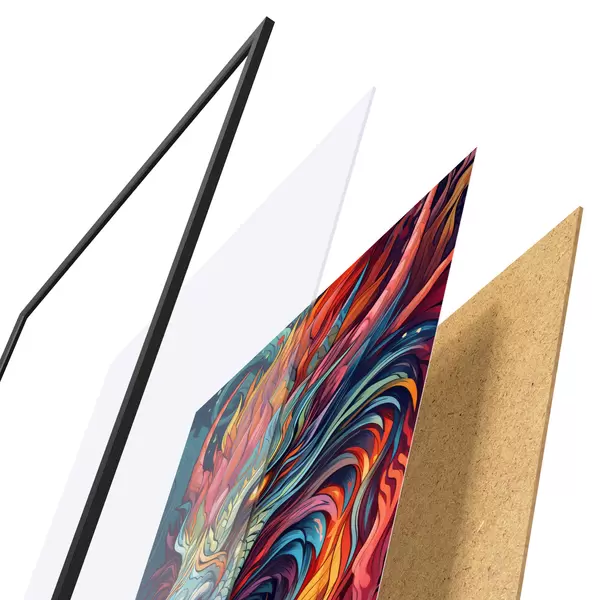 De poster bestaat uit een frame, plexiglas, geprinte afbeelding en spaanplaat achterkant. De poster kan meteen aan de muur worden gehangen dankzij de bevestigingen op de achterkant.