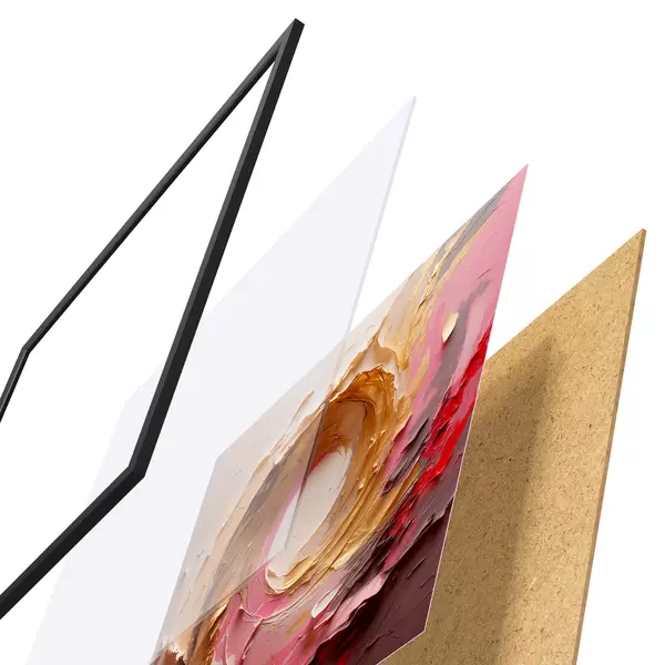 De poster bestaat uit een frame, plexiglas, geprinte afbeelding en spaanplaat achterkant. De poster kan meteen aan de muur worden gehangen dankzij de bevestigingen op de achterkant.