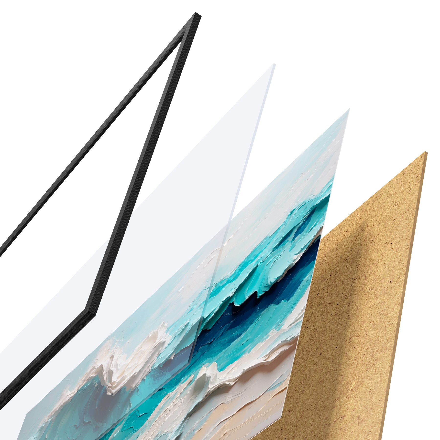 De poster bestaat uit een frame, plexiglas, geprinte afbeelding en spaanplaat achterkant. De poster kan meteen aan de muur worden gehangen dankzij de bevestigingen op de achterkant.