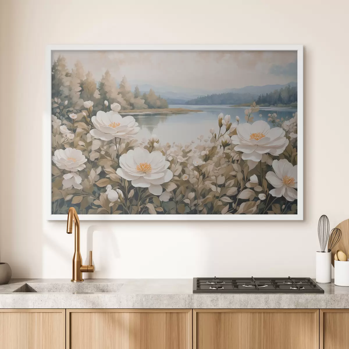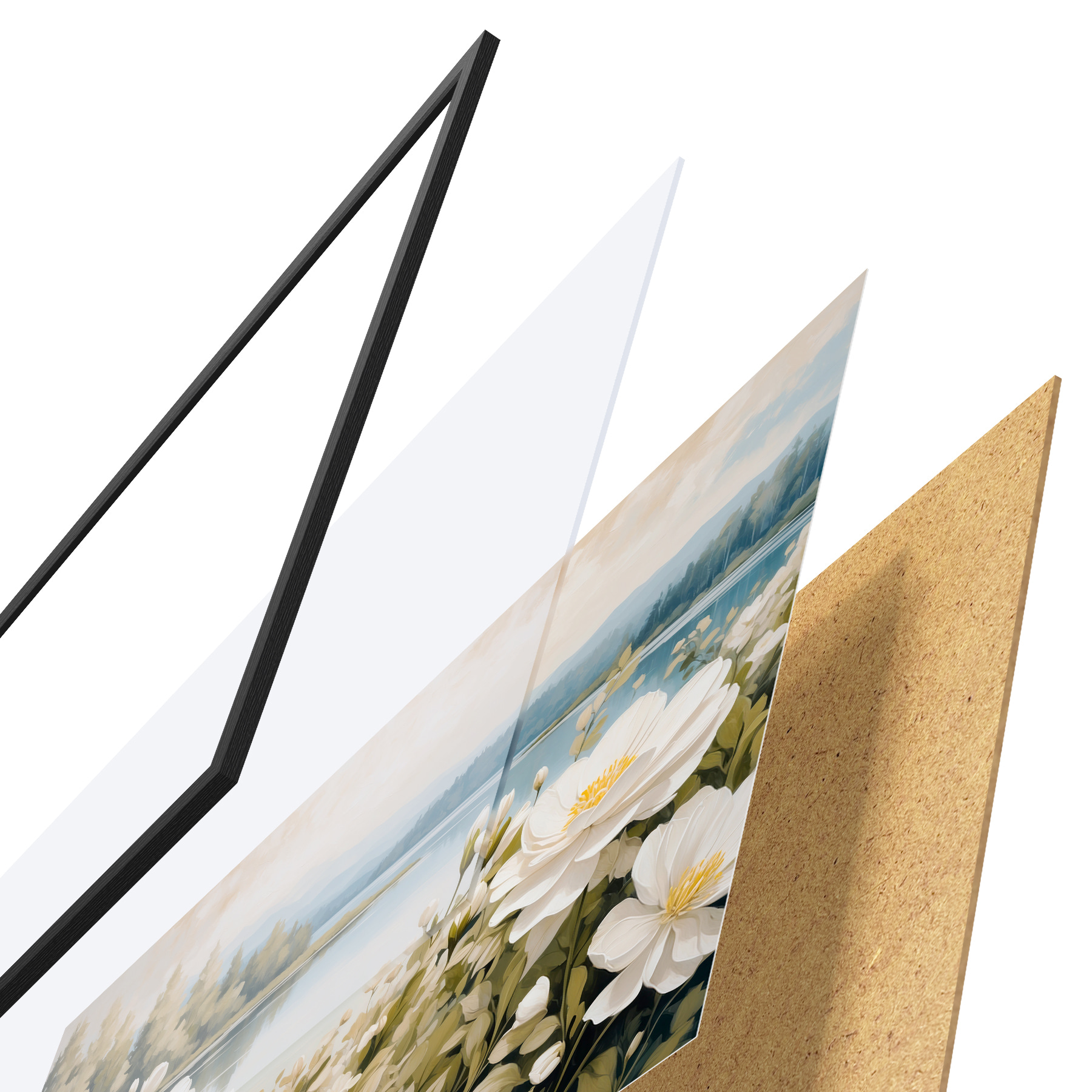 Poster Witte bloemen op rivierachtergrond Nr f40869