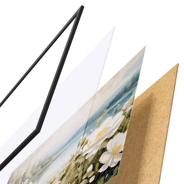De poster bestaat uit een frame, plexiglas, geprinte afbeelding en spaanplaat achterkant. De poster kan meteen aan de muur worden gehangen dankzij de bevestigingen op de achterkant.