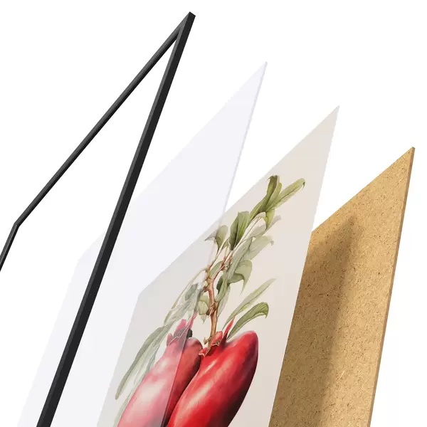 De poster bestaat uit een frame, plexiglas, geprinte afbeelding en spaanplaat achterkant. De poster kan meteen aan de muur worden gehangen dankzij de bevestigingen op de achterkant.