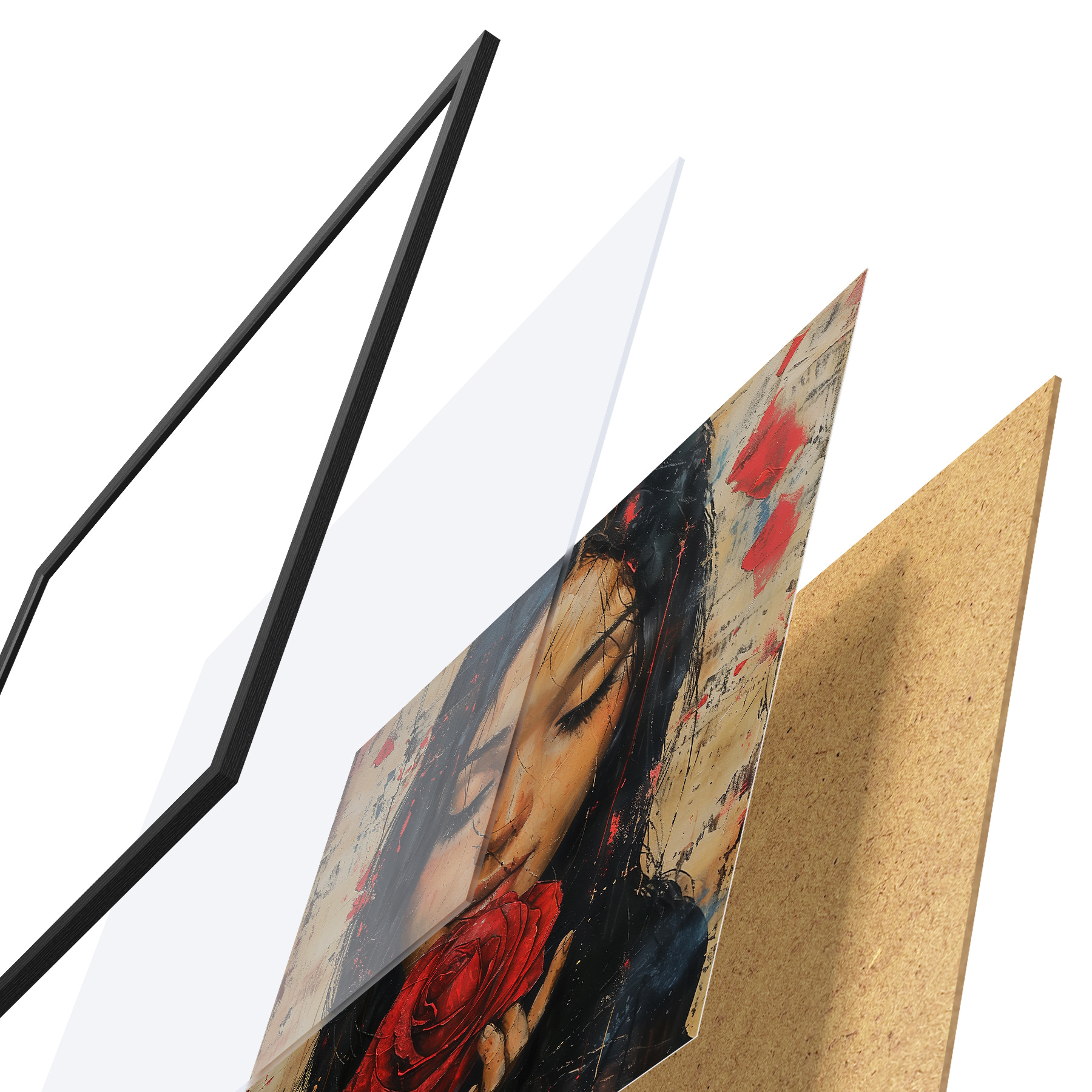 De poster bestaat uit een frame, plexiglas, geprinte afbeelding en spaanplaat achterkant. De poster kan meteen aan de muur worden gehangen dankzij de bevestigingen op de achterkant.