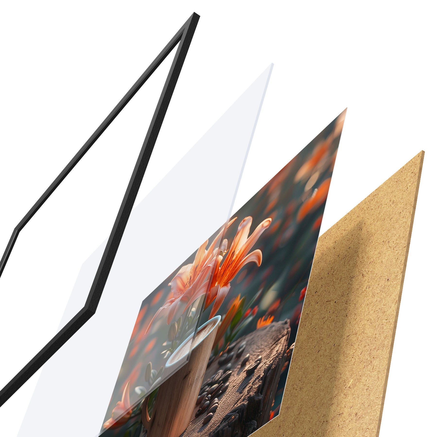 De poster bestaat uit een frame, plexiglas, geprinte afbeelding en spaanplaat achterkant. De poster kan meteen aan de muur worden gehangen dankzij de bevestigingen op de achterkant.