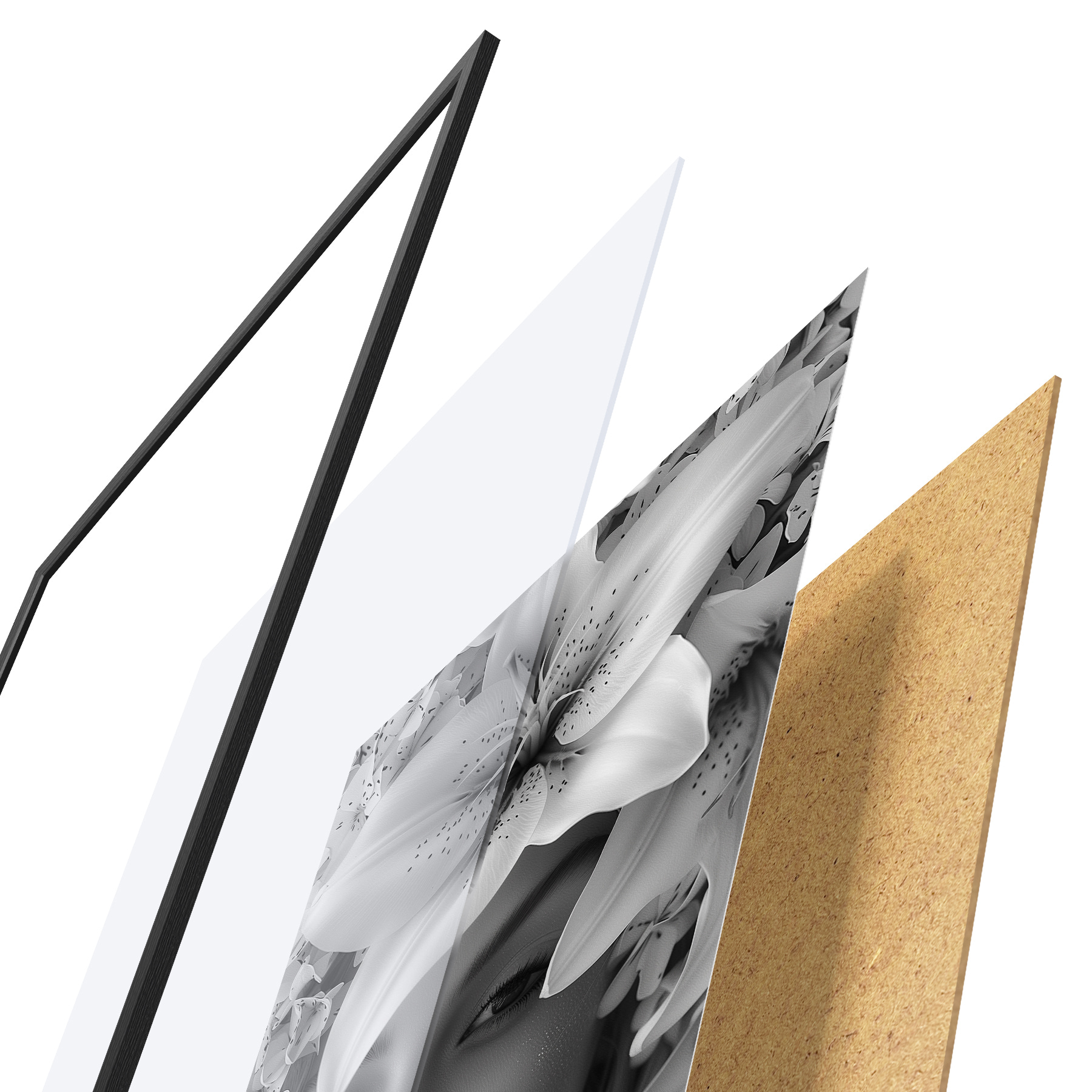 De poster bestaat uit een frame, plexiglas, geprinte afbeelding en spaanplaat achterkant. De poster kan meteen aan de muur worden gehangen dankzij de bevestigingen op de achterkant.