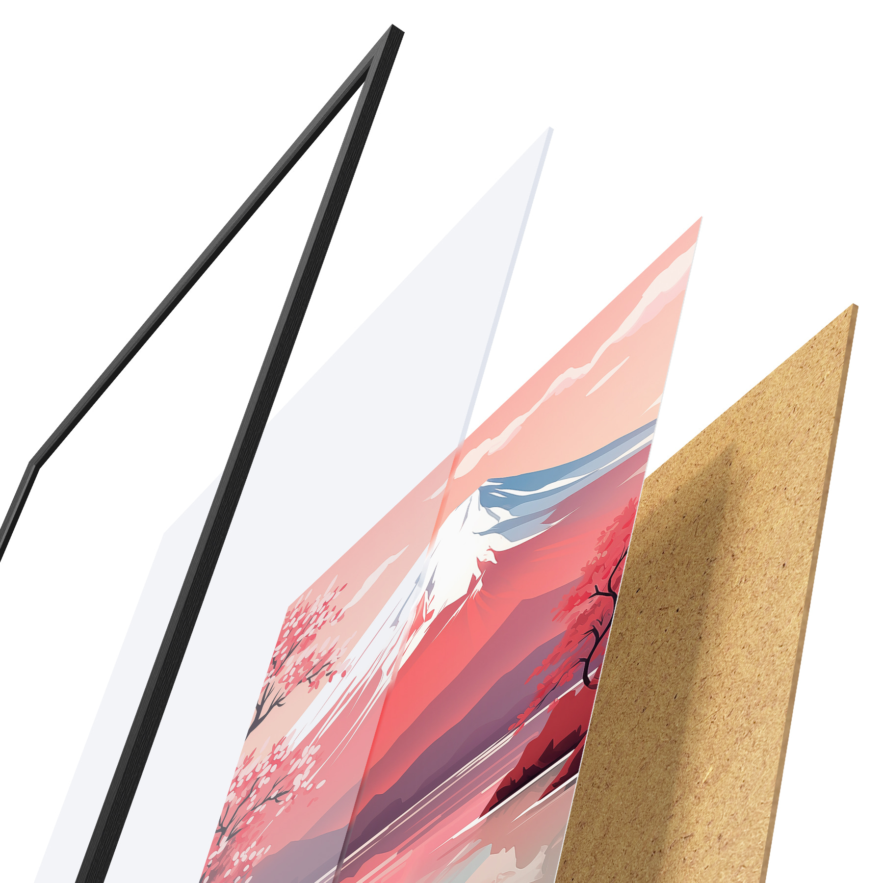 De poster bestaat uit een frame, plexiglas, geprinte afbeelding en spaanplaat achterkant. De poster kan meteen aan de muur worden gehangen dankzij de bevestigingen op de achterkant.