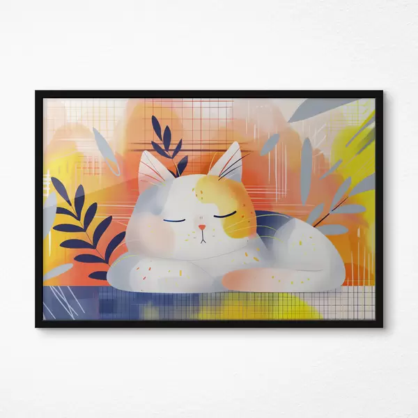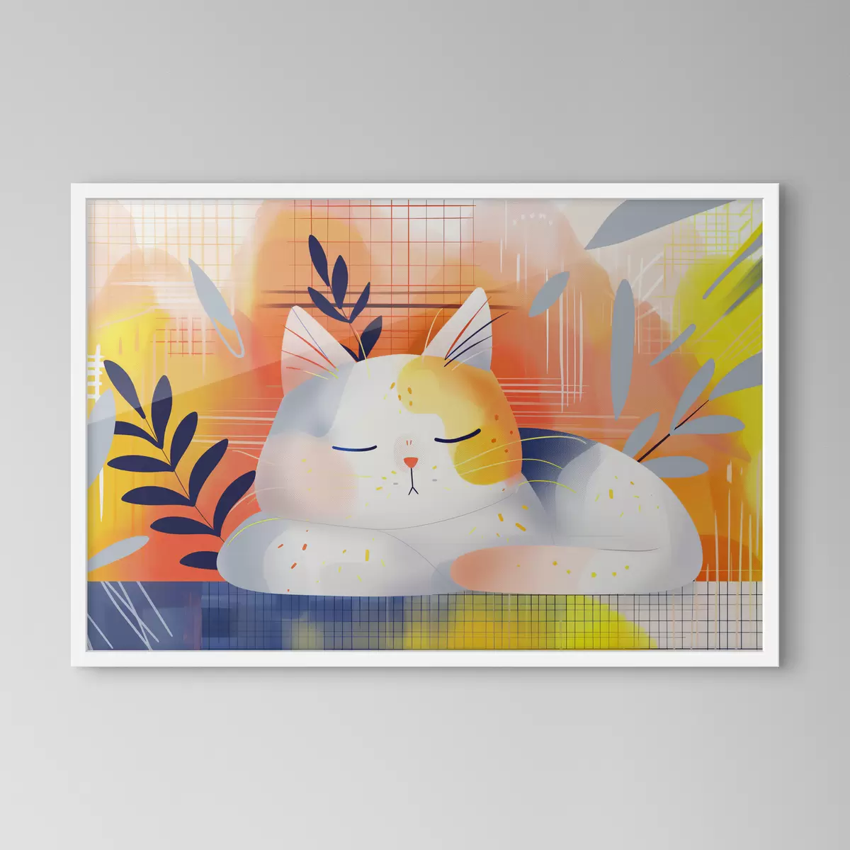 Poster Een schattige kat slapend tussen de planten in een grafische stijl Nr f40956