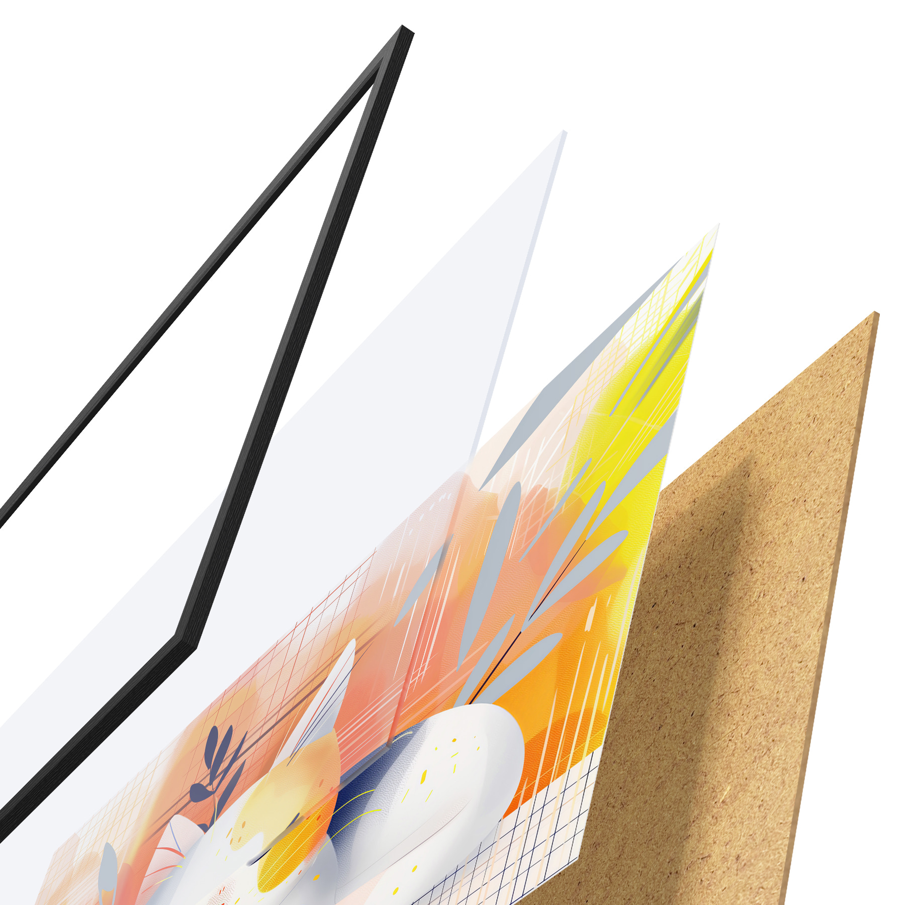De poster bestaat uit een frame, plexiglas, geprinte afbeelding en spaanplaat achterkant. De poster kan meteen aan de muur worden gehangen dankzij de bevestigingen op de achterkant.