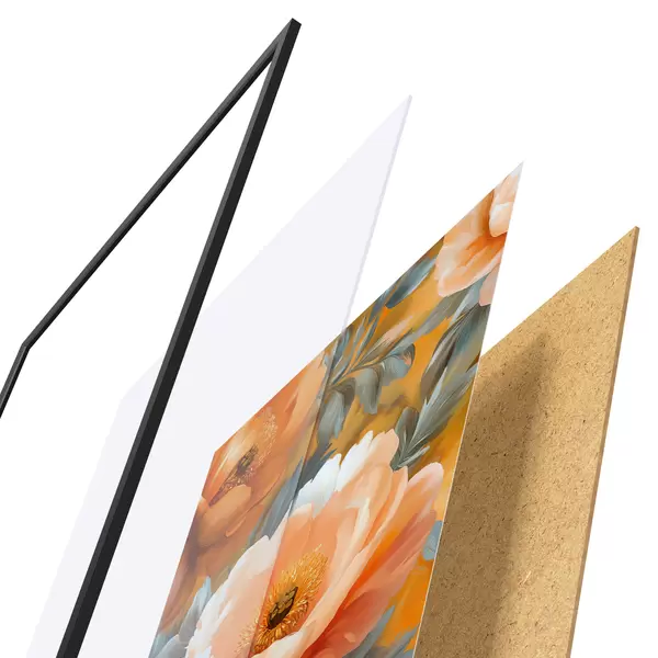 De poster bestaat uit een frame, plexiglas, geprinte afbeelding en spaanplaat achterkant. De poster kan meteen aan de muur worden gehangen dankzij de bevestigingen op de achterkant.