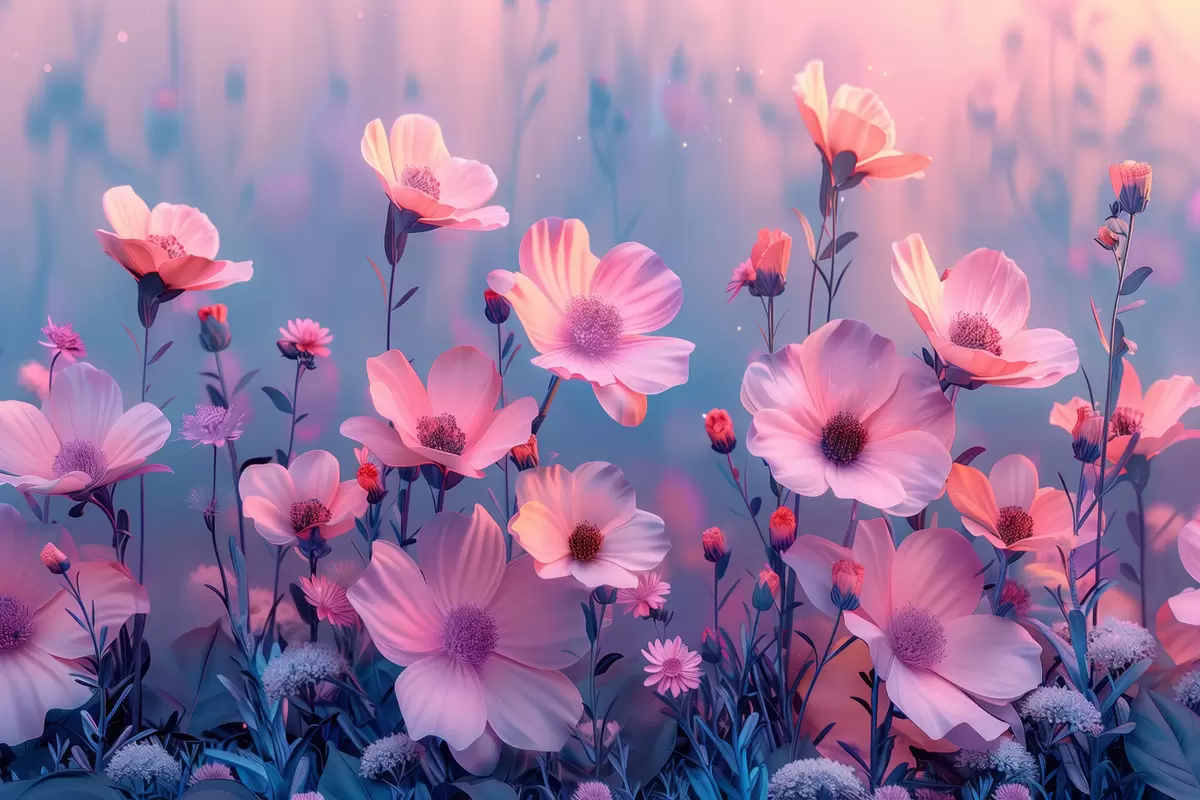 Poster Sprookjesachtige wilde bloemen in roze en blauwe tinten f40990