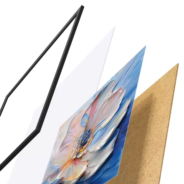 De poster bestaat uit een frame, plexiglas, geprinte afbeelding en spaanplaat achterkant. De poster kan meteen aan de muur worden gehangen dankzij de bevestigingen op de achterkant.