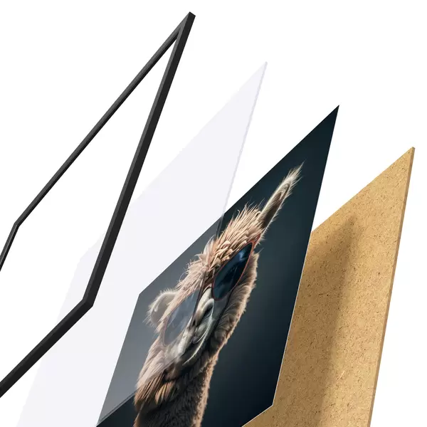 De poster bestaat uit een frame, plexiglas, geprinte afbeelding en spaanplaat achterkant. De poster kan meteen aan de muur worden gehangen dankzij de bevestigingen op de achterkant.