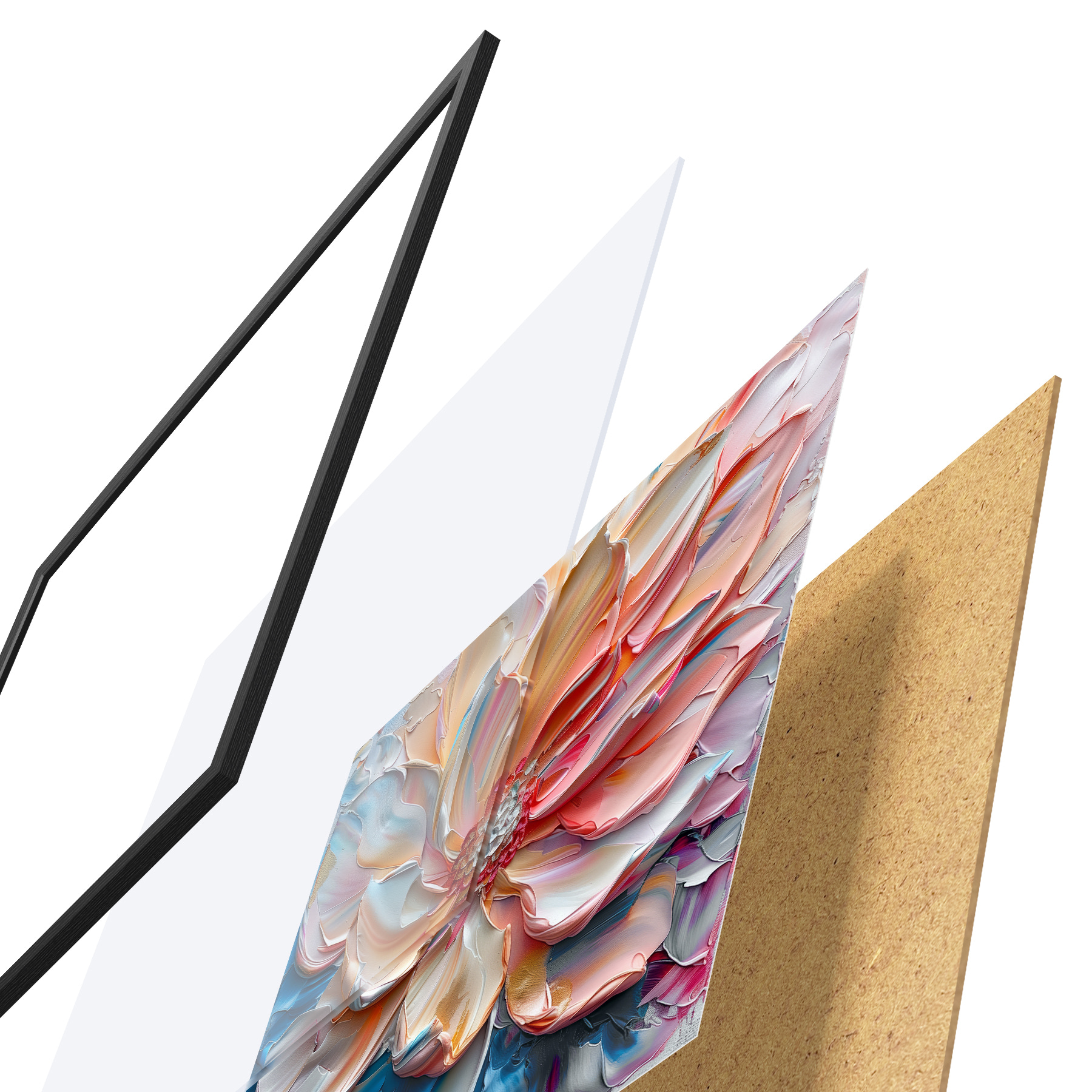 De poster bestaat uit een frame, plexiglas, geprinte afbeelding en spaanplaat achterkant. De poster kan meteen aan de muur worden gehangen dankzij de bevestigingen op de achterkant.