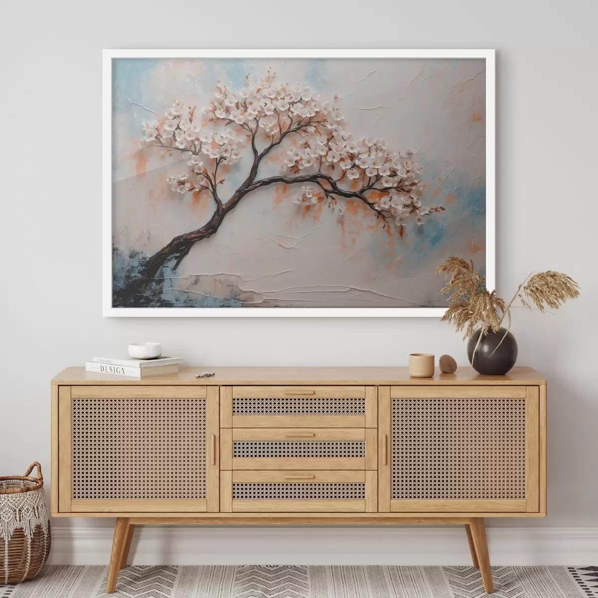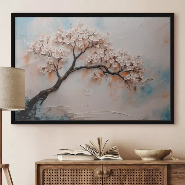 Poster Bloeiende boom op abstracte olieverfachtergrond f41032