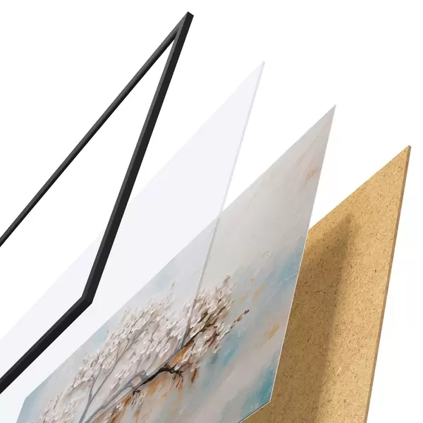 De poster bestaat uit een frame, plexiglas, geprinte afbeelding en spaanplaat achterkant. De poster kan meteen aan de muur worden gehangen dankzij de bevestigingen op de achterkant.