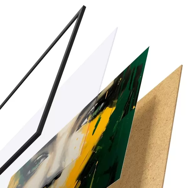 De poster bestaat uit een frame, plexiglas, geprinte afbeelding en spaanplaat achterkant. De poster kan meteen aan de muur worden gehangen dankzij de bevestigingen op de achterkant.