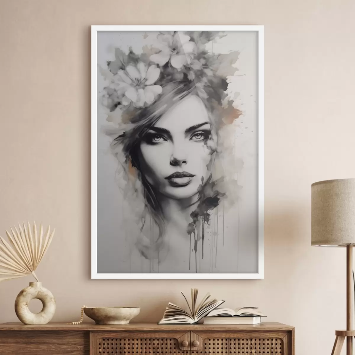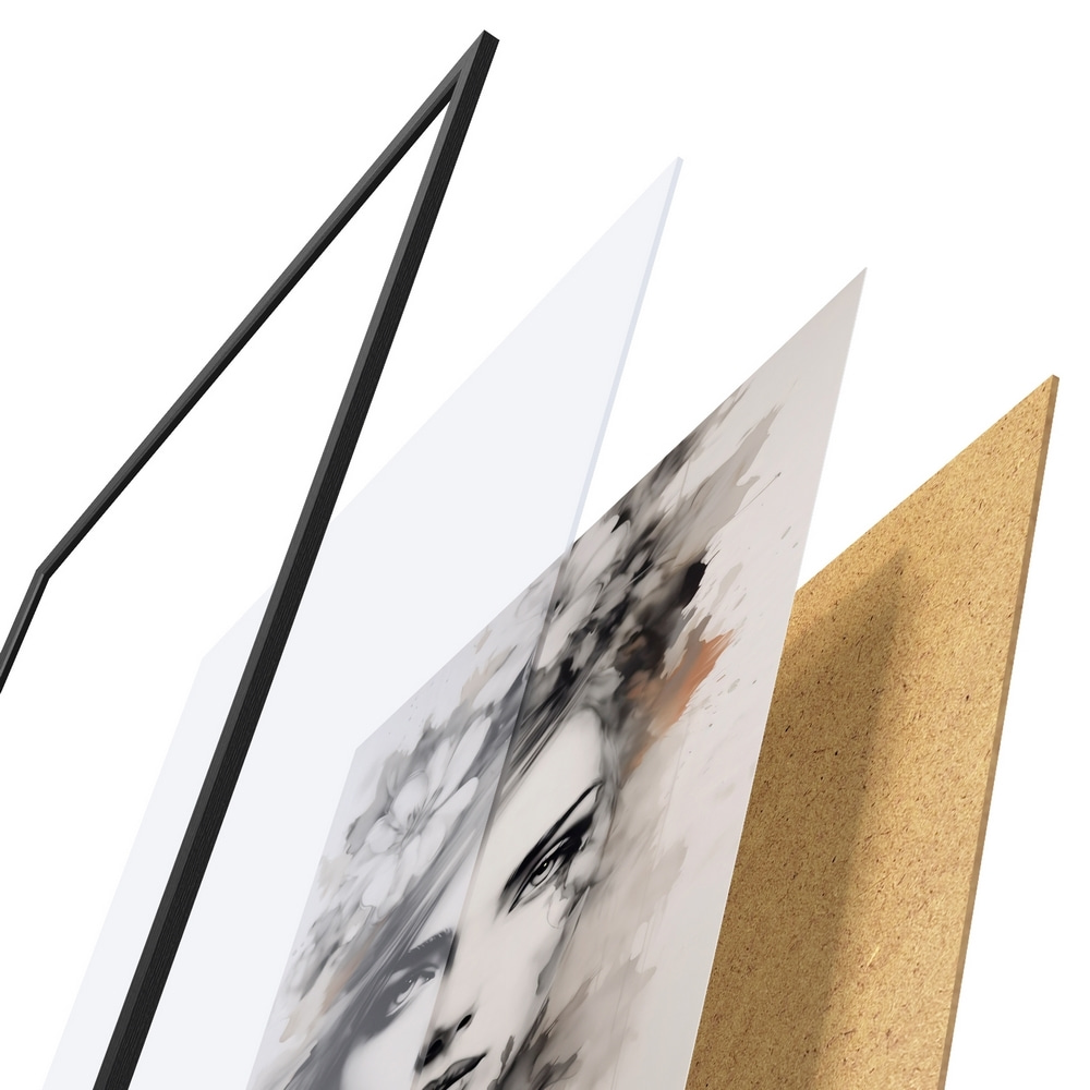De poster bestaat uit een frame, plexiglas, geprinte afbeelding en spaanplaat achterkant. De poster kan meteen aan de muur worden gehangen dankzij de bevestigingen op de achterkant.