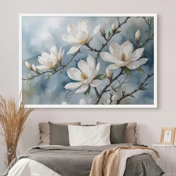 Poster Witte magnolia bloemen bloeiend op boomtakken tegen een zachte aquarel blauwe lucht achtergrond f41081
