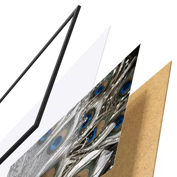 De poster bestaat uit een frame, plexiglas, geprinte afbeelding en spaanplaat achterkant. De poster kan meteen aan de muur worden gehangen dankzij de bevestigingen op de achterkant.