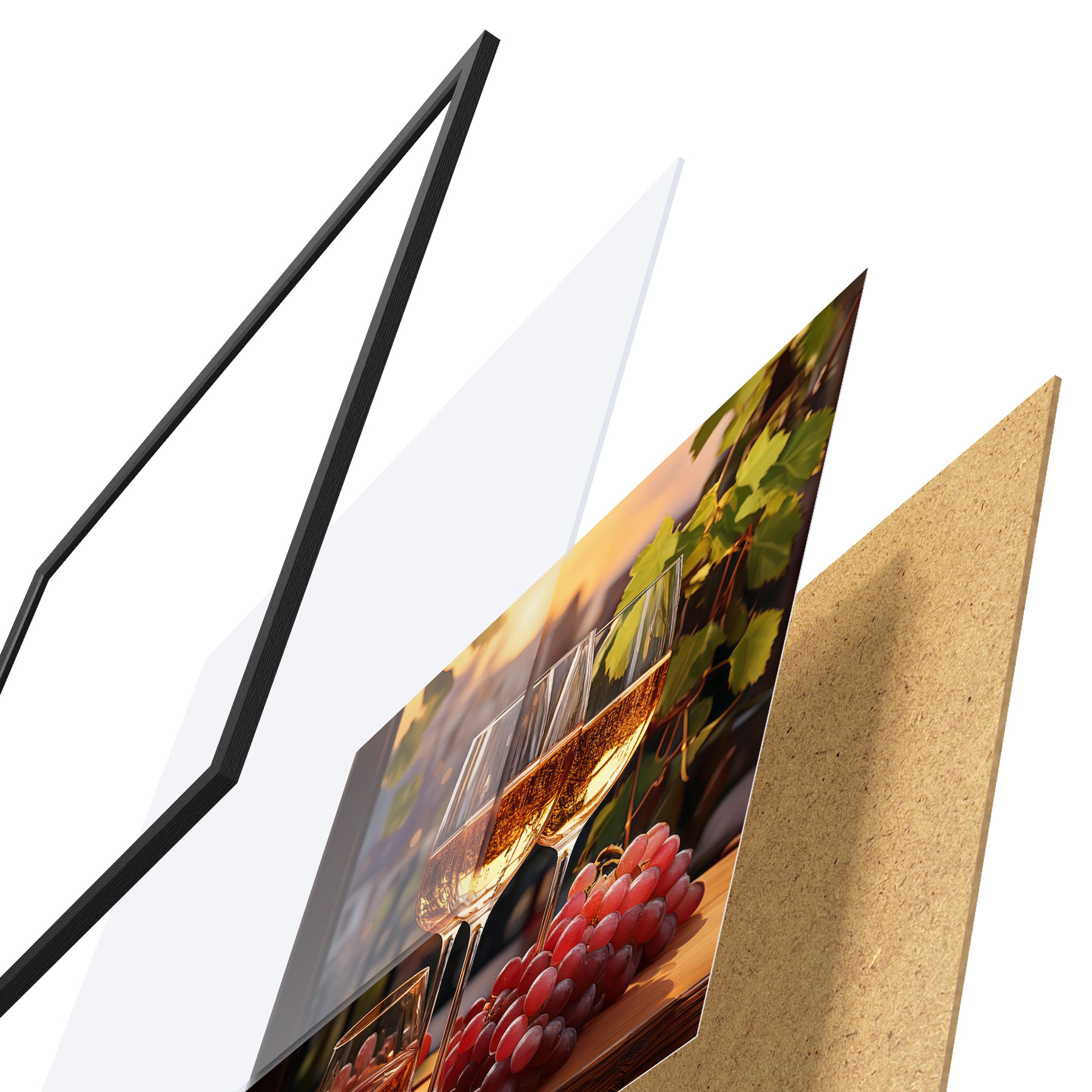 De poster bestaat uit een frame, plexiglas, geprinte afbeelding en spaanplaat achterkant. De poster kan meteen aan de muur worden gehangen dankzij de bevestigingen op de achterkant.