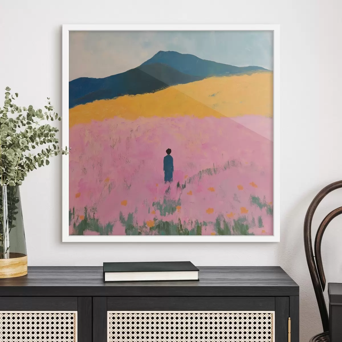 Poster Een man in een veld met roze bloemen f41164