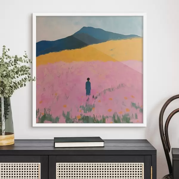 Poster Een man in een veld met roze bloemen Nr f41164