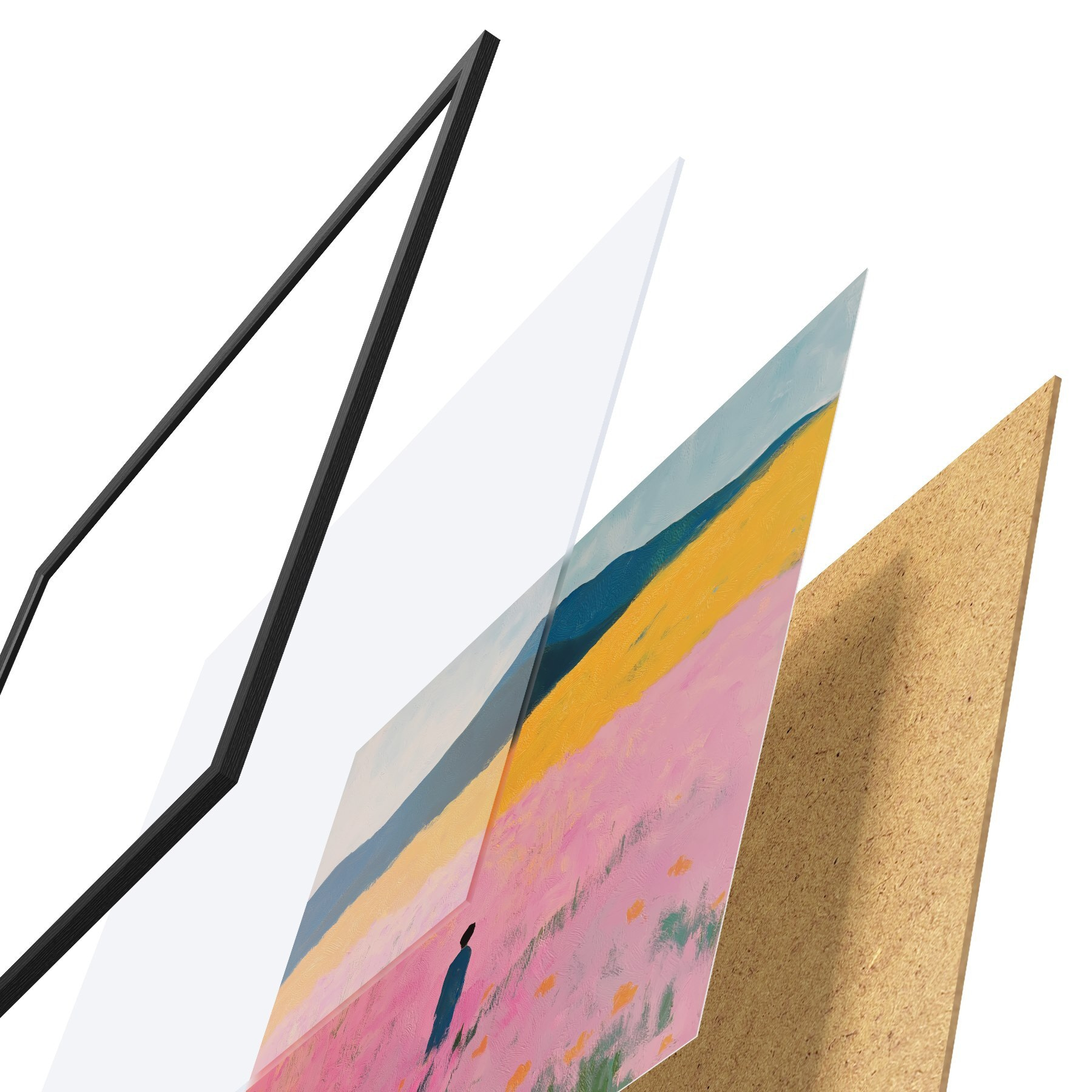De poster bestaat uit een frame, plexiglas, geprinte afbeelding en spaanplaat achterkant. De poster kan meteen aan de muur worden gehangen dankzij de bevestigingen op de achterkant.