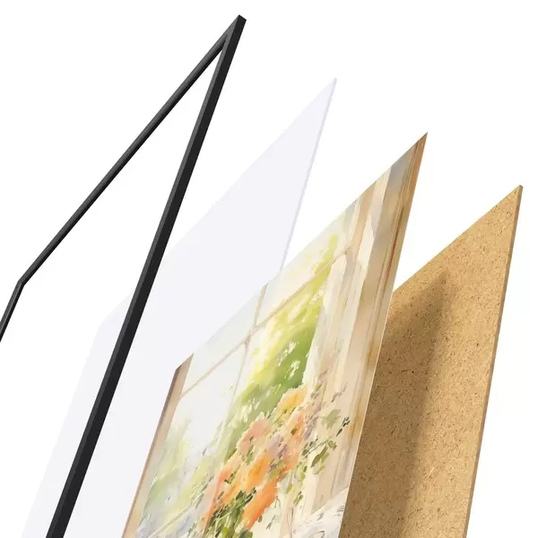 De poster bestaat uit een frame, plexiglas, geprinte afbeelding en spaanplaat achterkant. De poster kan meteen aan de muur worden gehangen dankzij de bevestigingen op de achterkant.
