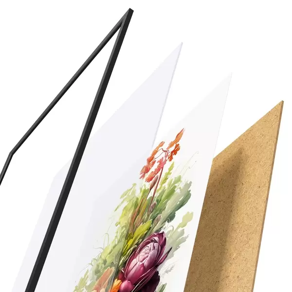 De poster bestaat uit een frame, plexiglas, geprinte afbeelding en spaanplaat achterkant. De poster kan meteen aan de muur worden gehangen dankzij de bevestigingen op de achterkant.
