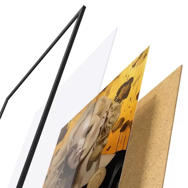 De poster bestaat uit een frame, plexiglas, geprinte afbeelding en spaanplaat achterkant. De poster kan meteen aan de muur worden gehangen dankzij de bevestigingen op de achterkant.
