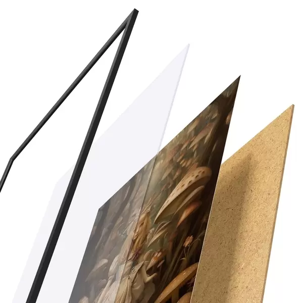 De poster bestaat uit een frame, plexiglas, geprinte afbeelding en spaanplaat achterkant. De poster kan meteen aan de muur worden gehangen dankzij de bevestigingen op de achterkant.