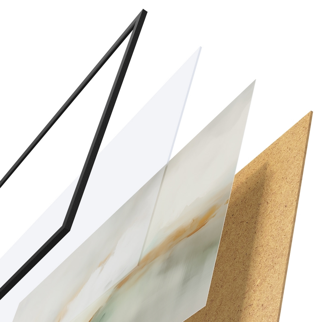 De poster bestaat uit een frame, plexiglas, geprinte afbeelding en spaanplaat achterkant. De poster kan meteen aan de muur worden gehangen dankzij de bevestigingen op de achterkant.